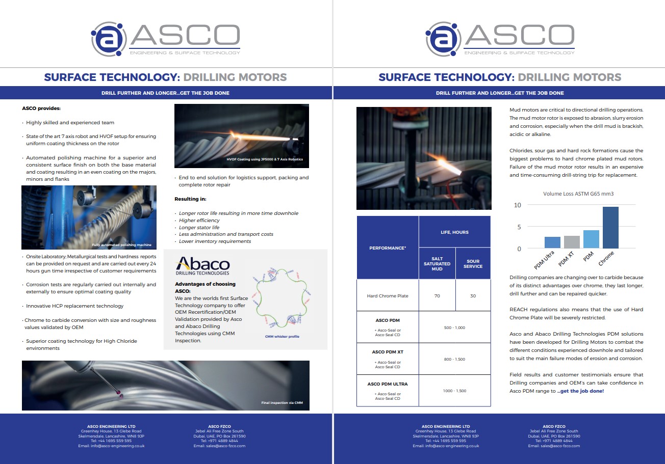 ASCO Engineering & Surface Technology now offers Mud Rotor coating repair in both our UK and UAE facilities, we can refurbish your damaged Mud Rotors back to 'as new' condition using fully automated 8 axis robotics and fully automated CNC polishing machines. Please take a look at our latest flyer and contact us for further information.